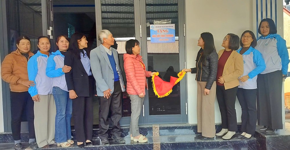 Đồng chí Nguyễn Kim Quý, Phó Chủ tịch Hội LHPN Hà Nội, Trưởng ban Công tác Phụ nữ - Ủy ban MTTQ Việt Nam TP Hà Nội cùng Hội LHPN xã Hồng Sơn bàn giao Mái ấm cho gia đình chị Ngô Thị Hạnh.