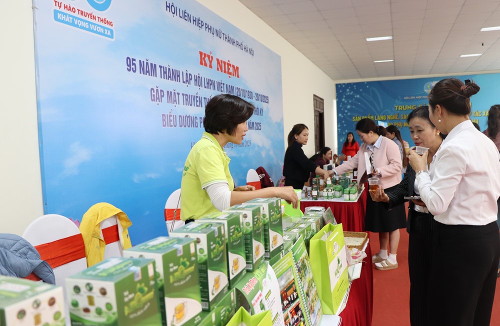 Ngay từ đầu giờ chiều, không gian trụ sở Hội rộn rã với 30 gian hàng trưng bày sản phẩm do phụ nữ quản lý - bao gồm nông sản, làng nghề truyền thống, sản phẩm OCOP và các mặt hàng ứng dụng công nghệ cao. Không gian trưng bày cũng cho thấy rõ định hướng phát triển bền vững của phụ nữ Thủ đô, khi các sản phẩm đều gắn với những phần việc thiết thực trong xây dựng nông thôn mới: từ mô hình gia đình 5 không, 3 sạch; 5 có, 3 sạch, đến phân loại – xử lý rác thải, cải tạo cảnh quan, phát triển nông nghiệp xanh và ứng dụng công nghệ trong sản xuất.