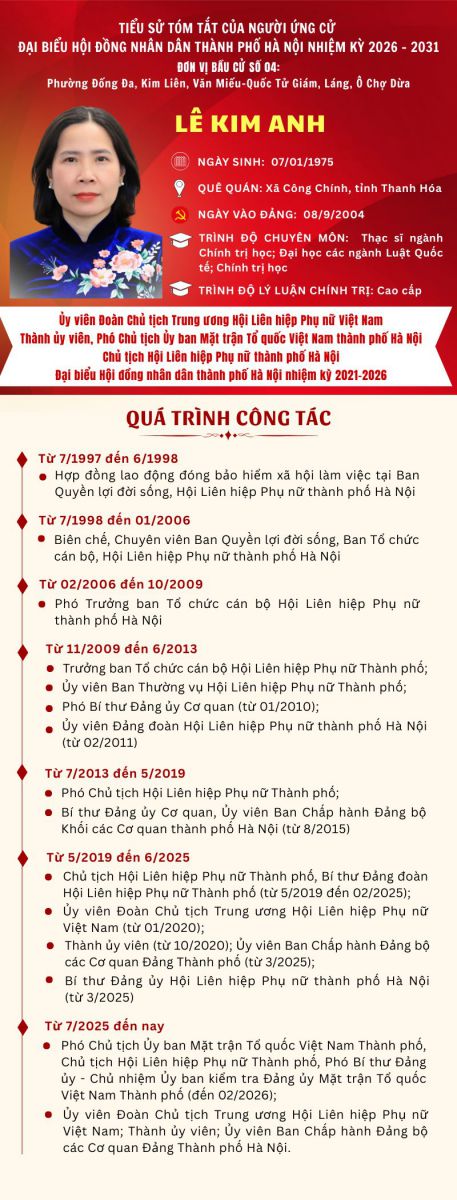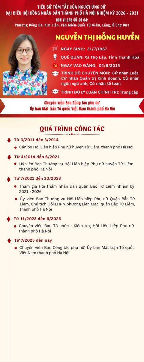 TIỂU SỬ TÓM TẮT 02 ĐỒNG CHÍ ĐẠI DIỆN PHỤ NỮ THỦ ĐÔ THAM GIA ỨNG CỬ ĐẠI BIỂU HỘI ĐỒNG NHÂN DÂN THÀNH PHỐ HÀ NỘI, NHIỆM KỲ 2026-2031 TẠI ĐƠN VỊ BẦU CỬ SỐ 4 (gồm các phường Đống Đa, Kim Liên, Văn Miếu - Quốc Tử Giám, Láng, Ô Chợ Dừa)